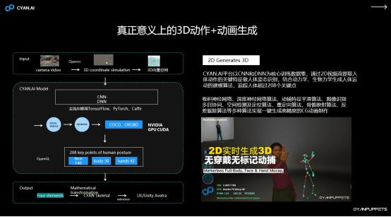 我们想为业界提供轻便化驱动3D资产的模型方案,主要是做2D视频实时生成3D动画,以神深度神经网络和卷积神经网络算法为核心,使输入的2D的视频源解析成面部、手指、肢体等全模块动作数据,再映射到3D引擎里实现生成3D动画。