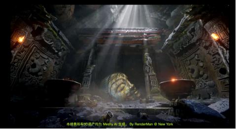 接下来是文字生成3D资产,主要是在游戏生成环境美术当中比较有用,比如你只要输入文字,就可以生成一个带贴图的3D模型,好处是使用非常方便,缺点是控制力不足。一个常见的问题是用户为啥不直接去SketchFab搜,因为其实经常找不到自己想要的东西,所以需要AI生成。这是我们用户创建的一个场景,里面所有的模型都是AI生成,虽然这样的效果目前还需要技巧,但也证明对于写实环境资产的中远景,Meshy的Text to 3D做的还不错。