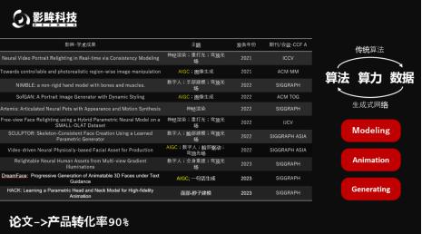 我们刚开始出来的时候从从一篇paper都没有一路升级打怪,我创这家公司时才大二,我们实验室之前一直是在图形学领域,但我们更加偏向于计算影像这个方向,我们解决的是怎么样把一个物品在三维世界或者在平面上表达出来。3D数字人、2D数字人神经渲染、图像生成的3D渲染等方面几乎是我们工作内容的全部了,但我们在开展这些科研的时候其实已经有这家公司了,所以会更加考虑怎么样去把这些东西落地。