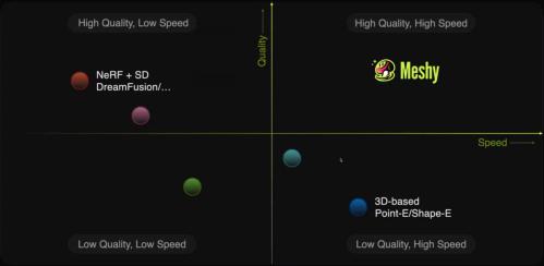 那么为什么现在还没有一个Leading Player呢?首先,是速度和质量的取舍。生成3D资产主要有两种方式,第一是生成多个视角的2D图片,然后通过NeRF之类优化的方式去得到3D模型,这种方法质量相对来说还不错,但实际上学术界和生产环境中要求的差别非常大;以及速度很慢,经常要等半小时或者几小时才能生成一个模型,对用户体验来说,反馈时间很长,对企业来说,要提供云端GPU去做优化,GPU成本很高,很可能入不敷出。另外一个极端像Open AI的PointE/ShapeE,速度很快,直接在3D基础上做生成,但由于3D数据的稀缺性,它的质量上不是特别好。我们希望做到速度快,并且质量也不错,如果把质量和速度分成四象限的话,我们希望做到右上角的位置。