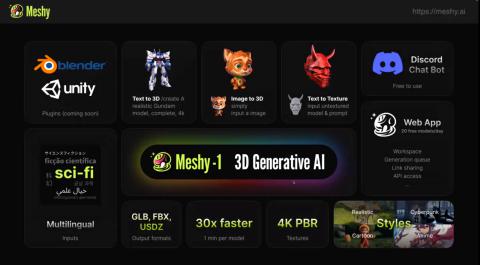 Meshy 有三个功能,分别是文字生成3D、图片生成3D、以及从文字生成贴图,同时能以兼容格式导入到下游的Unity、UE、Blender进一步编辑。我们先解决了"速度"的问题,虽然快和好存在取舍,但是我们先把快的问题解决才能够让更多用户用起来。此外还支持4K的PDR贴图生成和风格控制,风格非常重要,如果一堆高质量资产放在一起如果风格不统一,看起来也将非常杂乱。我们也有Unity和Blender插件后面会上线,并且我们特别重视多语言支持,可以直接用多国语言写提示词。