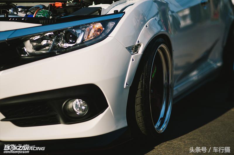 眼前这辆经过全车包围的改装的新思域,在造型上更加的凶悍,更具攻击性。