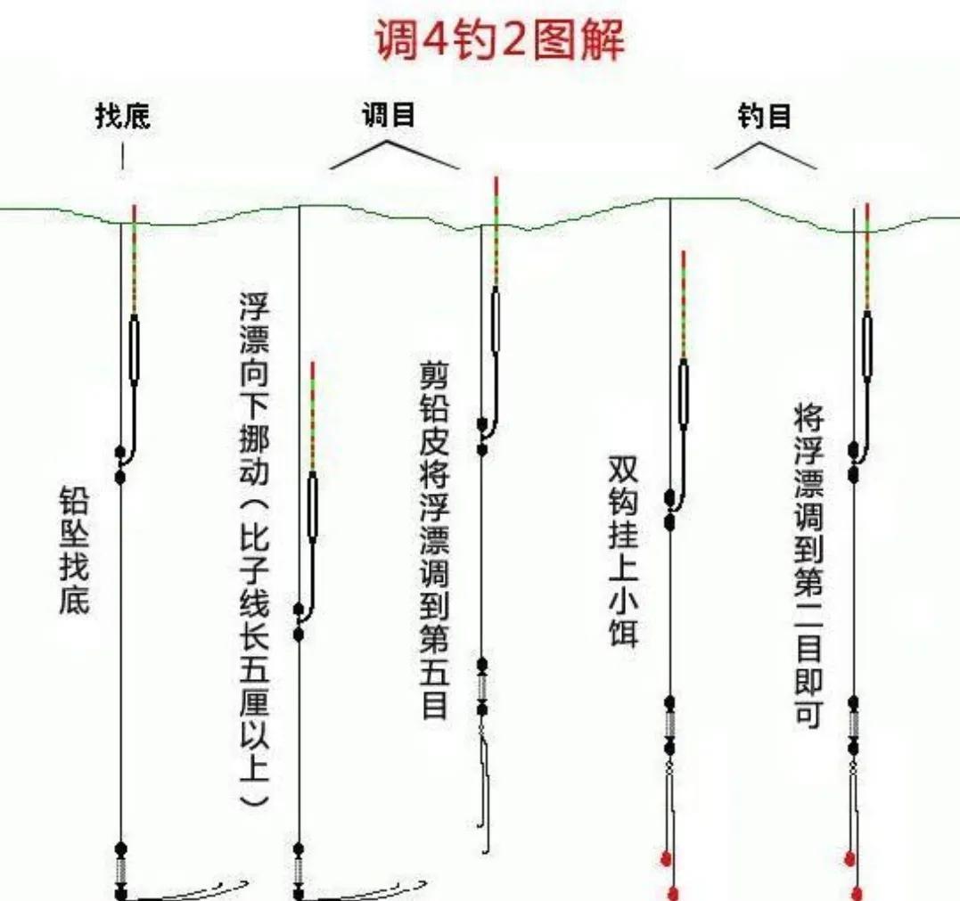 说到调漂,只要是钓鱼人,应该首先听到的就是调四钓二,这种调漂代表了台钓最初的调钓形态。在实战应用中,调四钓二的调漂方法,双钩会出现各种不同的水下状态。我们所说调四钓二是指带双钩调漂。