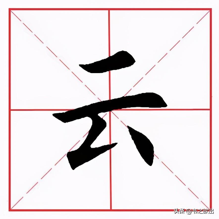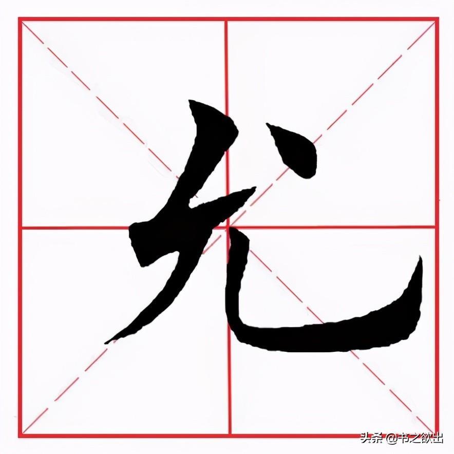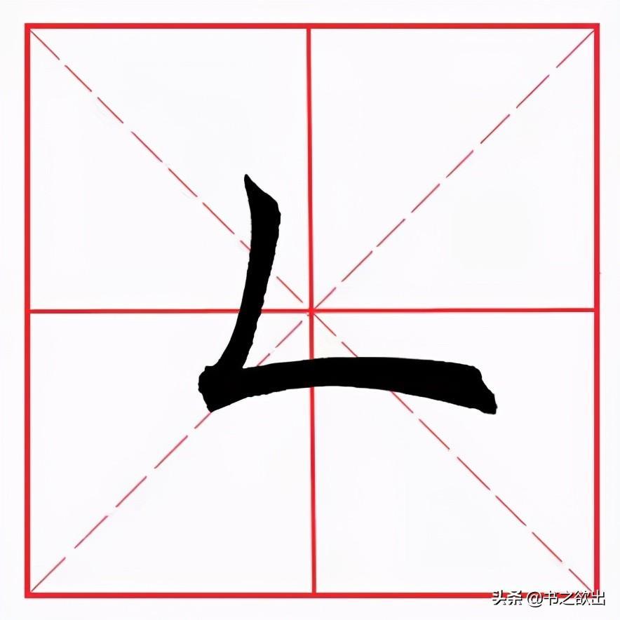 起笔斜切,稍厚重,然后向左下写撇,撇身稍直,向下渐轻,不要写长,到位后笔锋不离纸面,稍往左带,然后略向下顿笔(注意顿角角尖向下),再折锋向右上行,缓抬笔锋收笔,坚定有力,不可一笔甩出。