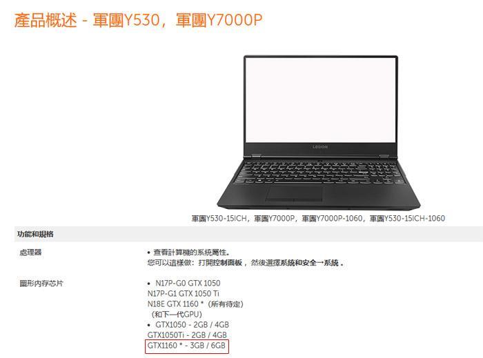 在联想的产品支持页面上,军团Y530和军团Y7000P的搭配显卡上面,出来GTX 1050和GTX 1050 Ti这两个熟悉的名字外,还出现了GTX 1160这个没见过的面孔,上面还标这这是下一代GPU,配有3GB和6GB显存。