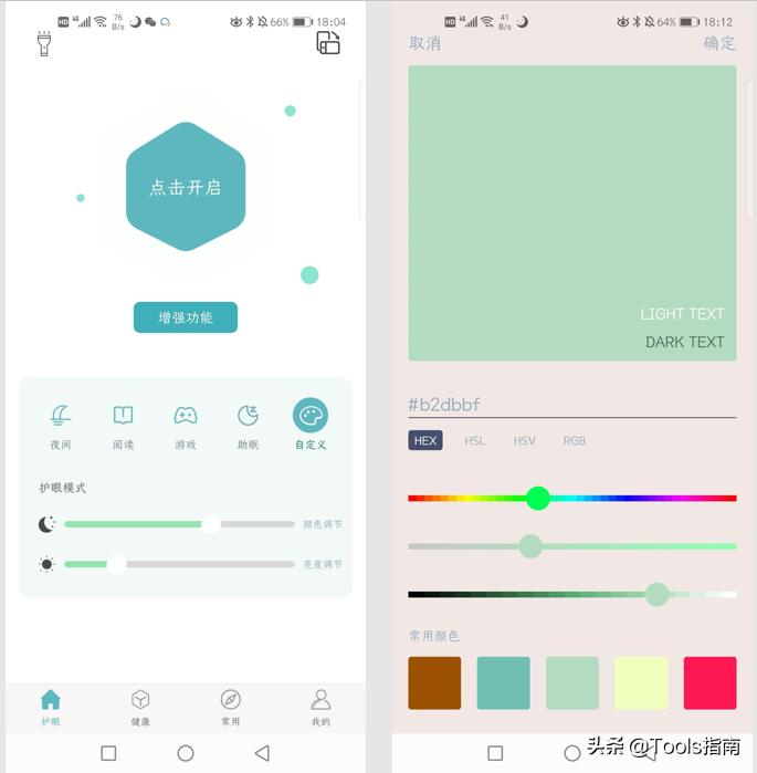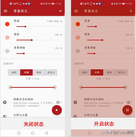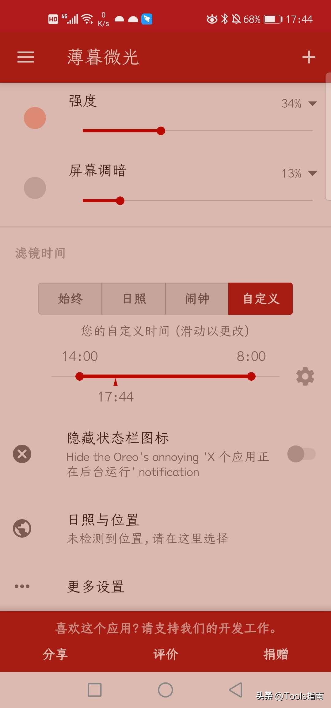 可以根据时间、位置,以及当前的环境,自动调整手机的色温。这种偏红光的色温,极大程度上避免了手机亮度刺眼的问题。