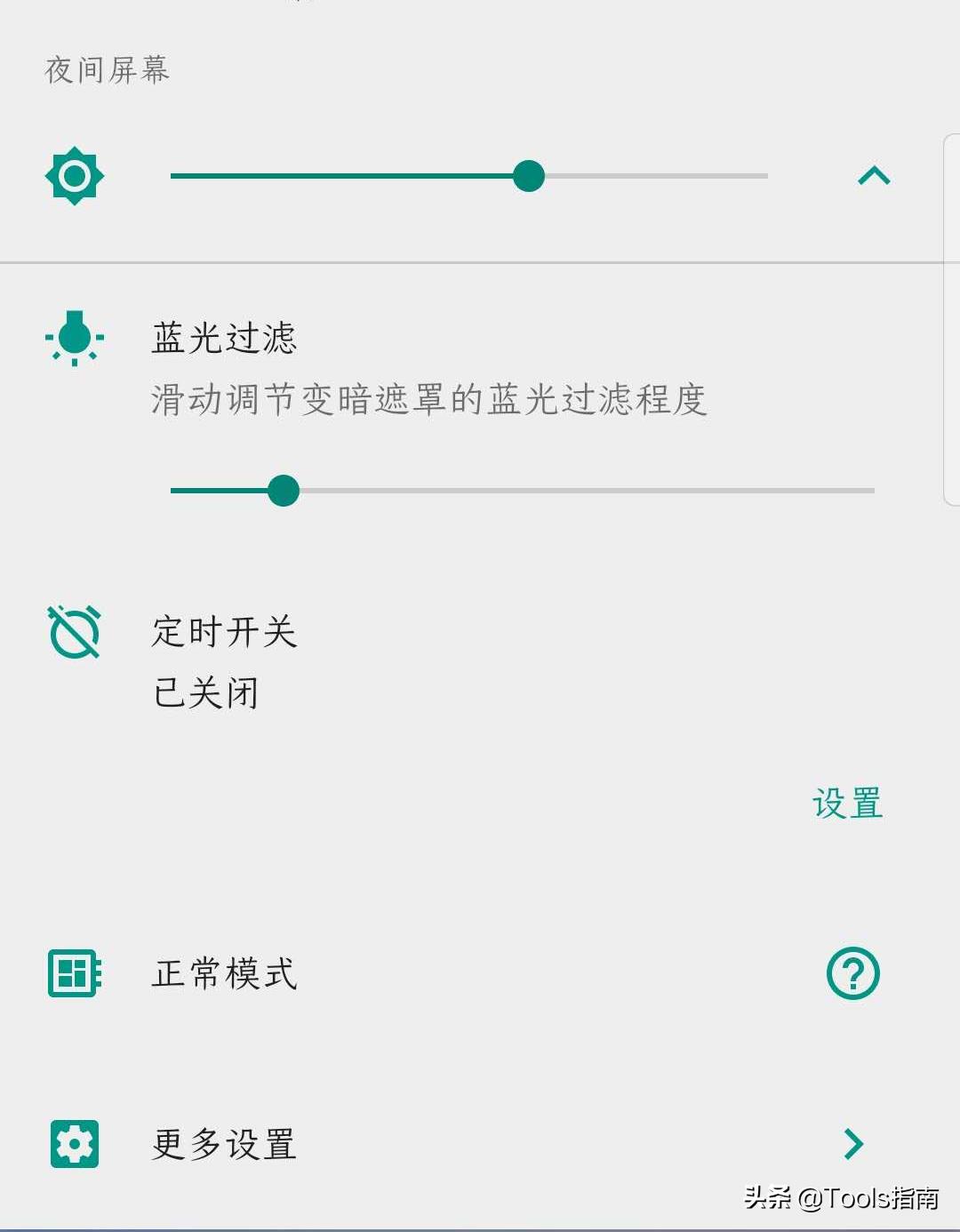 在设置中,可以调节蓝光过滤,以及定时开关: