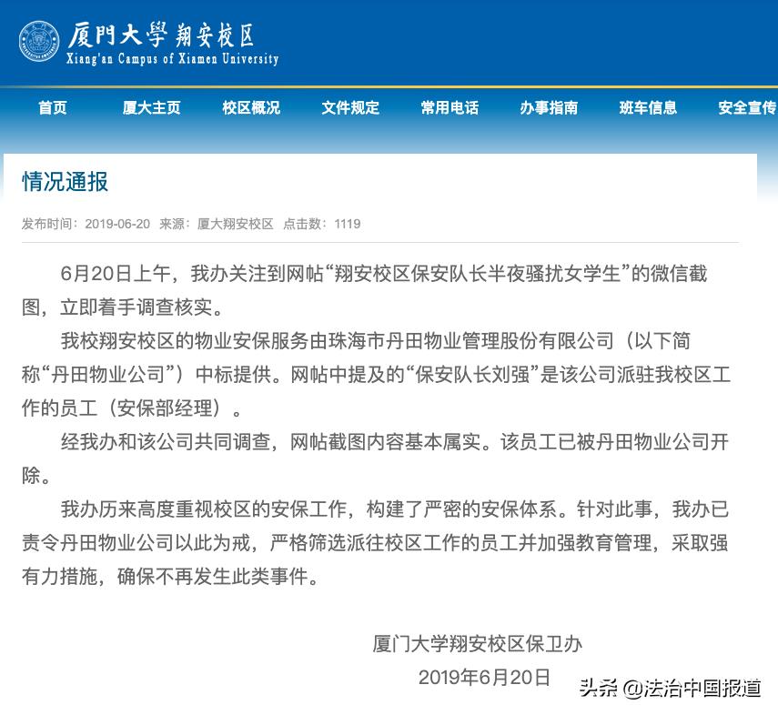 厦大回应保安队长骚扰女生:内容属实,已开除保安队长