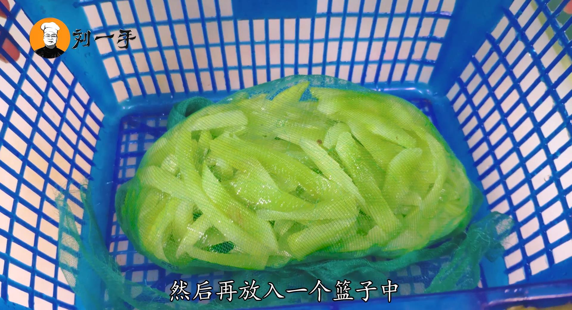 5、腌制时间到时,到出莴笋水。然后把莴笋倒入一个干净的塑料网当中,袋口系紧把里面水压出来,压出来以后莴笋吃起来口感更加爽脆,然后再放入一个篮子中,上面再压上一个二十斤的油桶,压6个小时