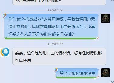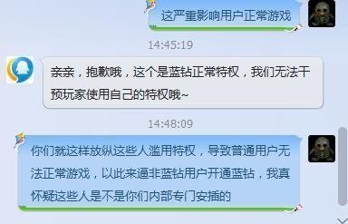 在这名用户在表明了“恶意使用特权”后,腾讯客服依旧给出含糊其辞的回答,不仅让用户心寒,更认为这是腾讯的特殊手段,以此来逼非蓝钻用户开通特权权限,并怀疑这些“恶意行驶特权”的人是腾讯内部专门安插的。
