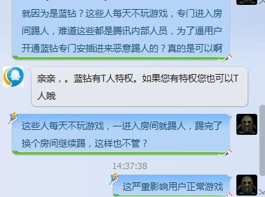 QQ蓝钻用户除了能获得游戏中的额外道具,还能施行蓝钻特权,即在游戏房间内随意踢出另外玩家,而蓝钻特权也有相应的等级区分,高级用户可踢除低级用户。近日,有用户抱怨在游戏中经常能遇到恶意行驶特权的用户,进游戏房间只踢人不进行游戏。而在用户向腾讯官方客服反映时,腾讯客服并未作出合理解释,仅告知用户“这是蓝钻正常特权,我们无法干预玩家使用自己的特权”。