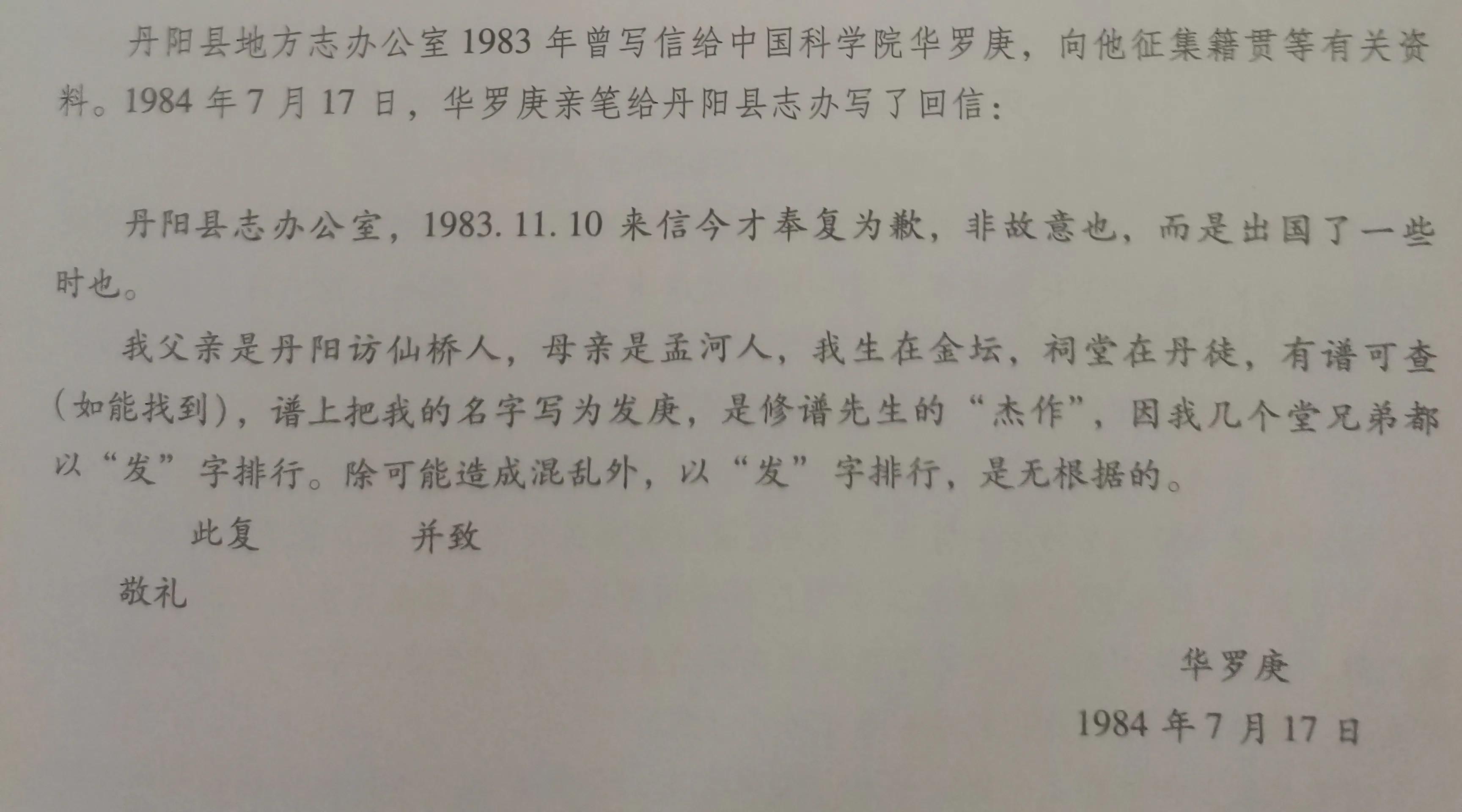 华罗庚给丹阳政府亲笔信内容: