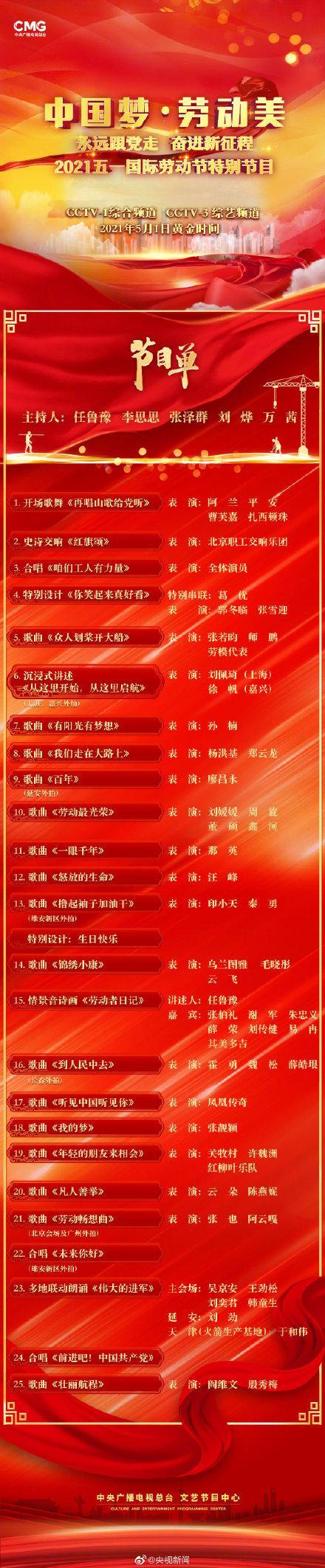 【央视五一晚会节目单出炉!你最期待谁的演出?】今天,五一劳动节。今晚20点档,锁定CCTV-1综合频道、CCTV-3综艺频道!央视五一晚会与你一起,向劳动者致敬转存节目单!