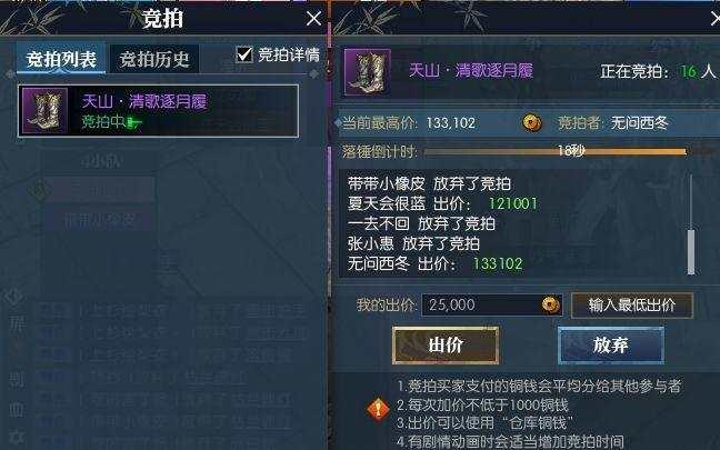 我跟随帮会完成了帮会的任务,打了3个大BOSS,得到4000多铜钱,答对4道题得几十万的经验值,爆出了一个紫装,一个队友以14w多的铜钱拍得。我的铜钱总数还不到2w,出价都没法出,最初有人1w1千铜钱,2w,苏遮幕一口气8w……直到有个人14w多成交。拍成功的扣掉相应的铜钱,其他未成功的都会退回来。
