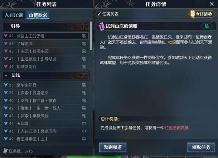 从1级打到58级来,一路打主线任务+师傅任务+一些神候令等,累积了许多经验,没费过什么劲就上来了,昨天回头看支线任务竟然只做了2个,今天做了1个,还有几十个没有做,这些支线任务做完,不知道要累计多少经验值。做过的支线任务:第二十二回,凤凰山下天初霁(熙春楼风波、奇遇·奇遇线索、境界提升),引导(试剑山庄的馈赠、了解论武、获得庄园、生活技能引导总览、初试仗剑行),支线(京华少年行,探索饮者追命,支线碧血营铁衣,雅集一生一世一双人,探索牢狱风云,玉咽雪,人在江湖客途问舟,老王寻亲记上)……支线任务有点多,不抄了。