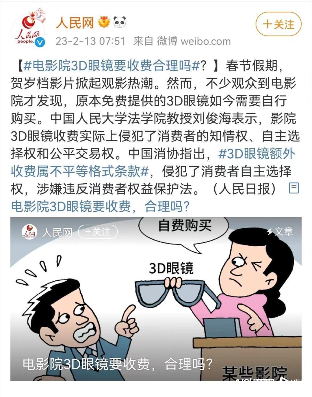 “3D眼镜需收费”话题在网上引发热议。近日,据人民日报报道,“不少观众到电影院才发现原本免费提供的3D眼镜如今需要自行购买”。在该消息中,“中国人民大学法学院教授刘俊海表示,影院3D眼镜收费实际上侵犯了消费者的知情权、自主选择权和公平交易权。而中国消协指出,3D眼镜额外收费属不平等格式条款侵犯了消费者自主选择权,涉嫌违反消费者权益保护法”。2月13日,南都记者走访了北京、上海、广州三地几大院线的主要影院,发现三地3D眼镜收费各不同。同时在广东地区发起了问卷调查显示:近九成广东观众表示曾被要求购买或租借3D眼镜。