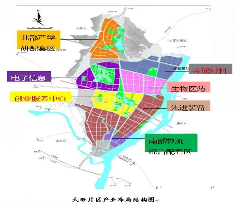 六区域:北部产学研配套区、南部物流区、电子信息区、生物医药区、先进装备区、金属新材料区;