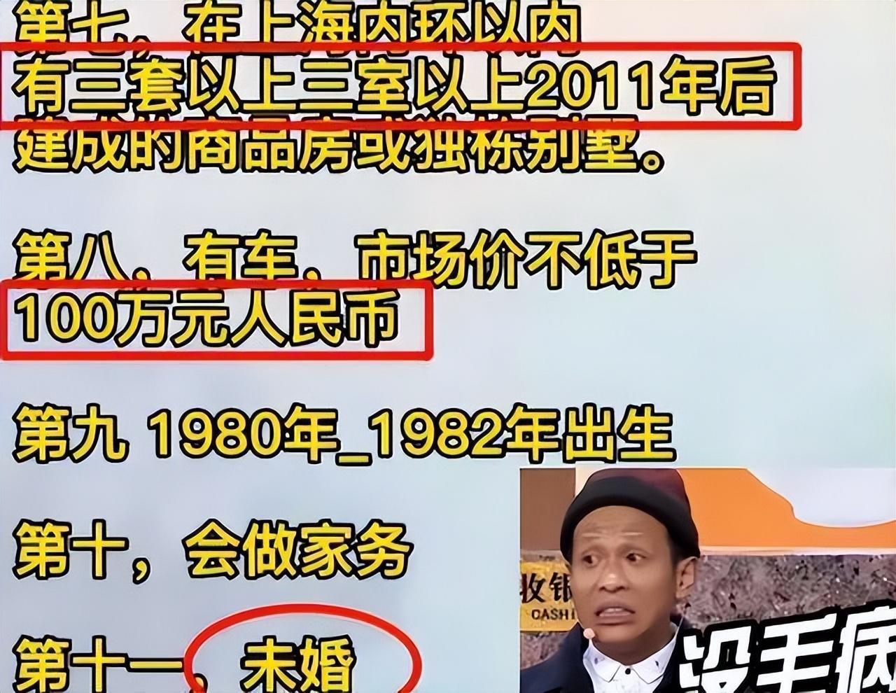 此外,王薇还对男方的年收入、车、房、出生日期,甚至家务能力都提出了要求。比如税后年薪必须过百万,上海内环起码3套商品房或别墅,车子不低于100万元,而且必须为1980年至1982年出生的男性,并且一定要会做家务。