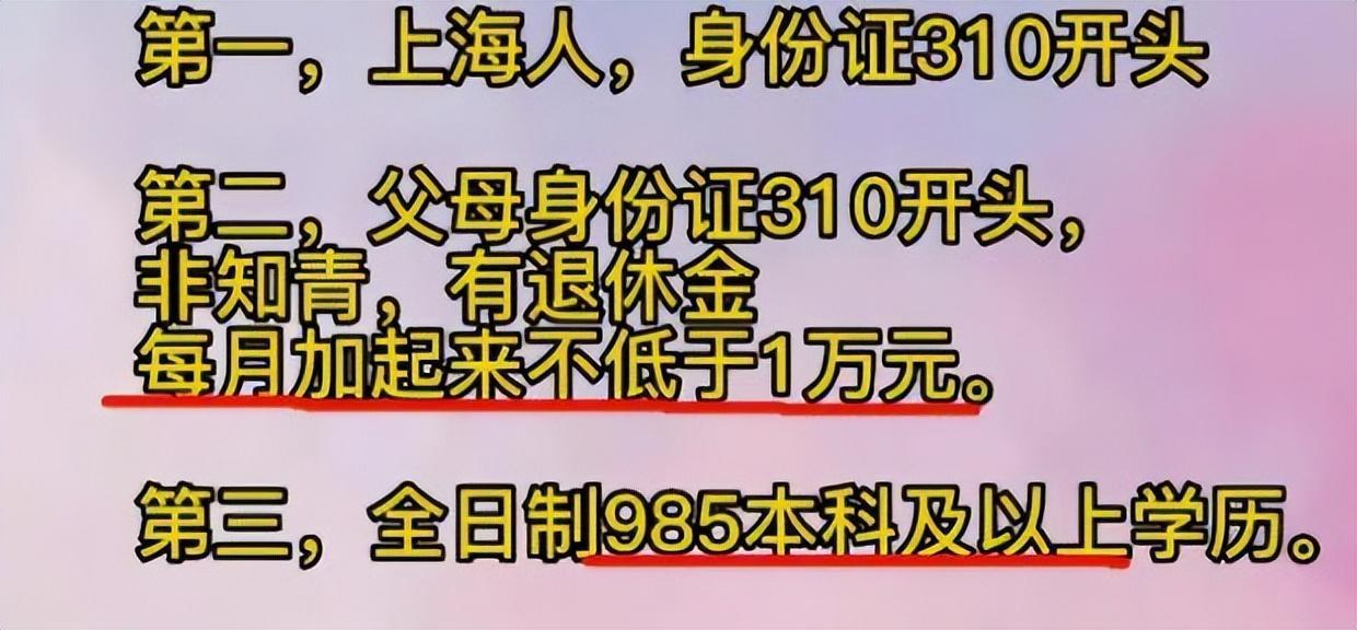 前五条征婚标准分别围绕男方的籍贯包括父母籍贯以及退休福利待遇、学历、身高长相几方面提出明确的要求,首先男方必须是上海人、父母要有退休金且不低于1万元,而且男方必的身高必须在180以上,长相还得英俊帅气、不能带眼镜,学历也必须是985的高材生。
