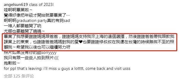 “因为有了她,我才懂得什么叫做无私的爱,一路走来我都用谦卑学习的心态来面对我人生的起伏!也用这样的态度来教导我的孩子~今天,是我大女儿Angel的毕业典礼!因为无私的爱把我们凝聚起来,很奇妙⋯谢谢我的过去造就我现在有的知足美好生活。人生,还有什么不可能呢?”