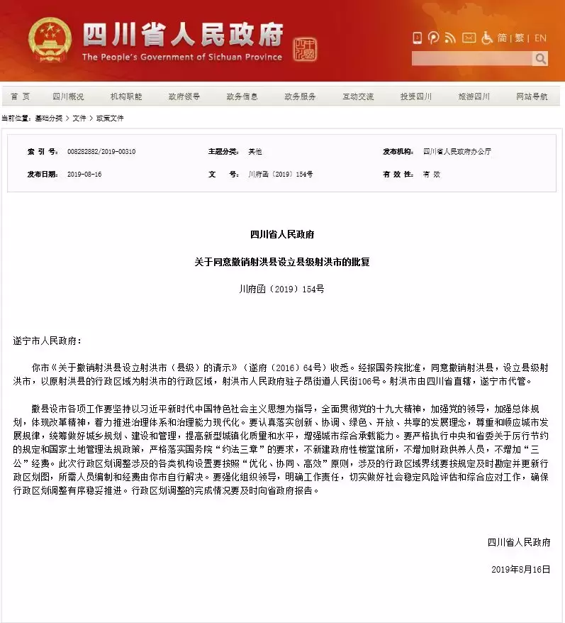 8月16日,四川省政府网站公布《四川省人民政府关于同意撤销射洪县设立县级射洪市的批复》(川府函〔2019〕154号)。