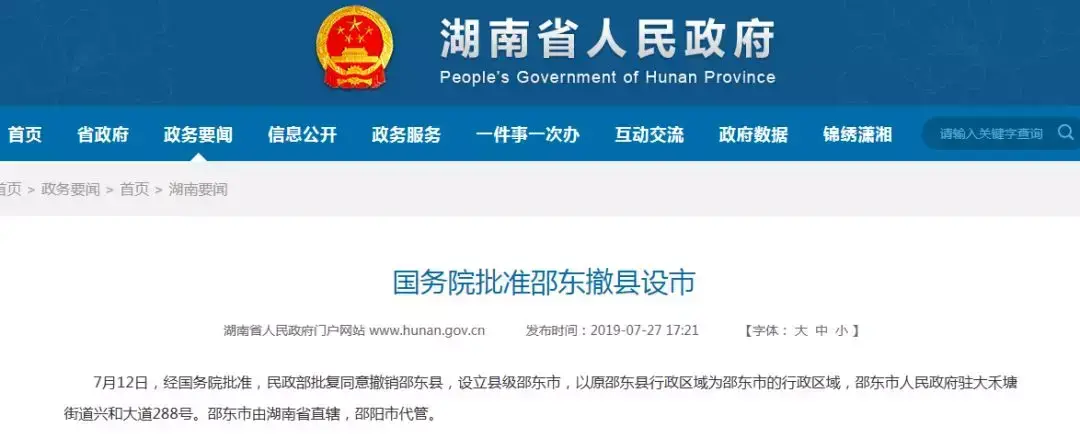 7月27日,据湖南省人民政府门户网站消息,7月12日,经国务院批准,民政部批复同意撤销邵东县,设立县级邵东市,由湖南省直辖,邵阳市代管。