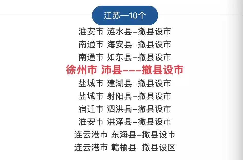 不过,淮安市涟水县、徐州沛县、盐城建湖县、连云港东海县等多个县域明确表示努力实现“撤县设市”。