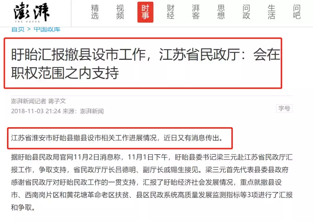 2018年11月份,关于盱眙撤县设市工作,得到省初步回应。江苏省民政厅回复:该项工作重新启动后,盱眙动作很快,工作也很扎实,省民政厅会在职权范围之内加以支持。