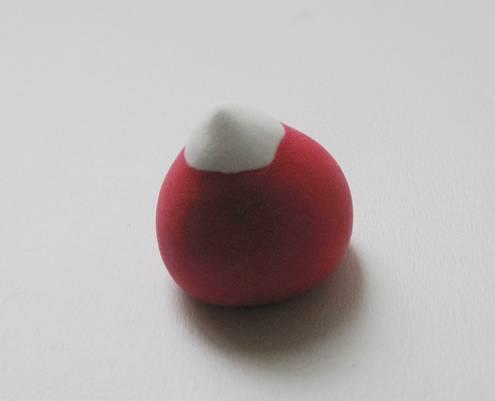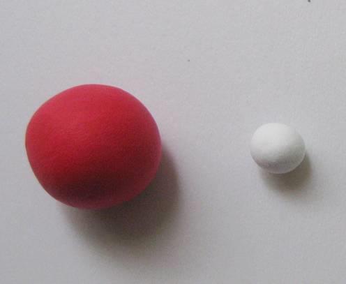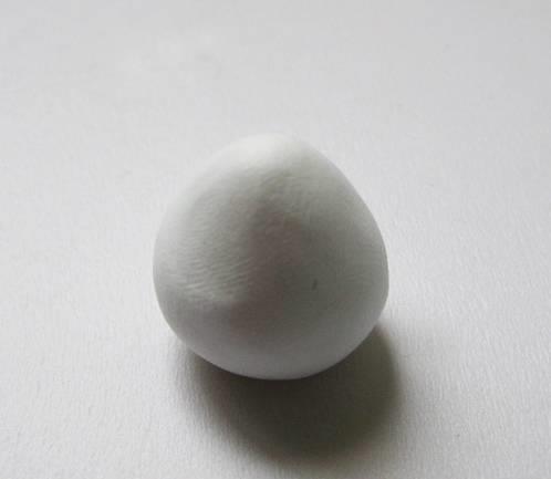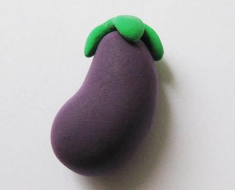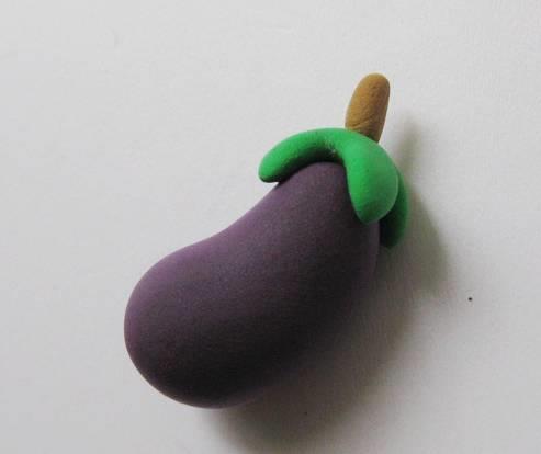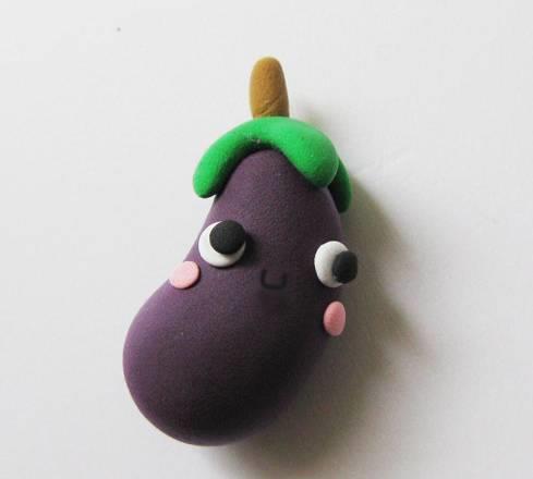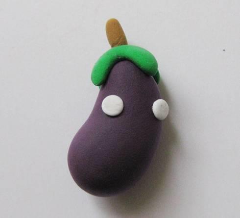 7、搓两个白色小圆球,压扁,贴在茄子的身体上当眼白。