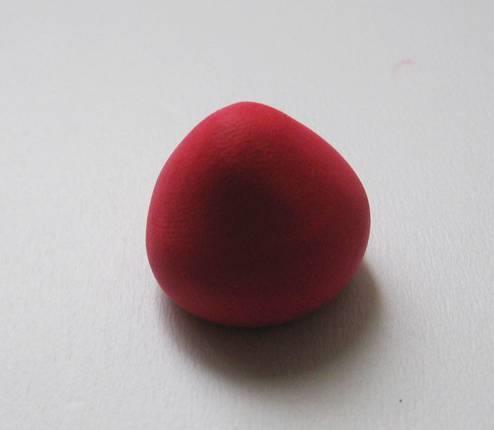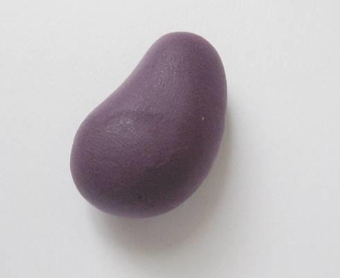 2、把紫色的粘土搓成上小下大的椭圆形,并让中间部分微弯。