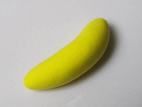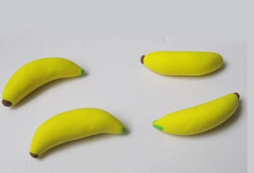 2、把小黄球搓成两端细细的,中间微微弯曲,香蕉的大概样子出来了。