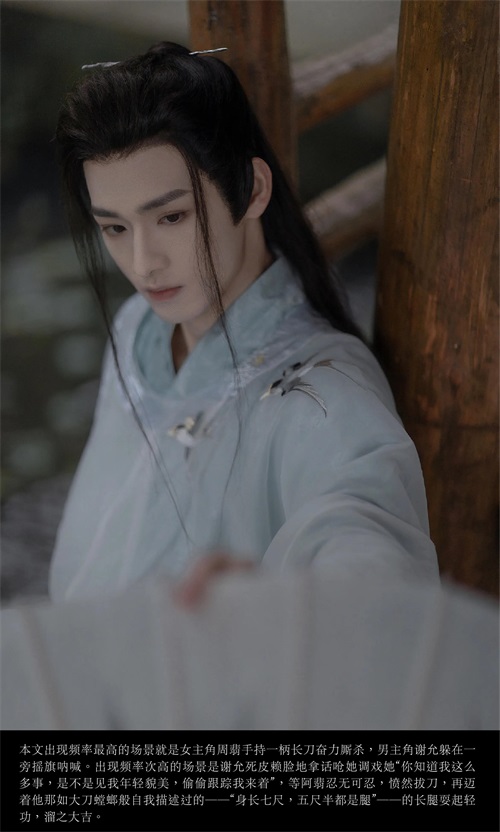 本文出现频率最高的场景就是女主角周翡手持一柄长刀奋力厮杀,男主角谢允躲在一旁摇旗呐喊。出现频率次高的场景是谢允死皮赖脸地拿话呛她调戏她“你知道我这么多事,是不是见我年轻貌美,偷偷跟踪我来着”,等阿翡忍无可忍,愤然拔刀,再迈着他那如大刀螳螂般自我描述过的——“身长七尺,五尺半都是腿”——的长腿耍起轻功,溜之大吉。