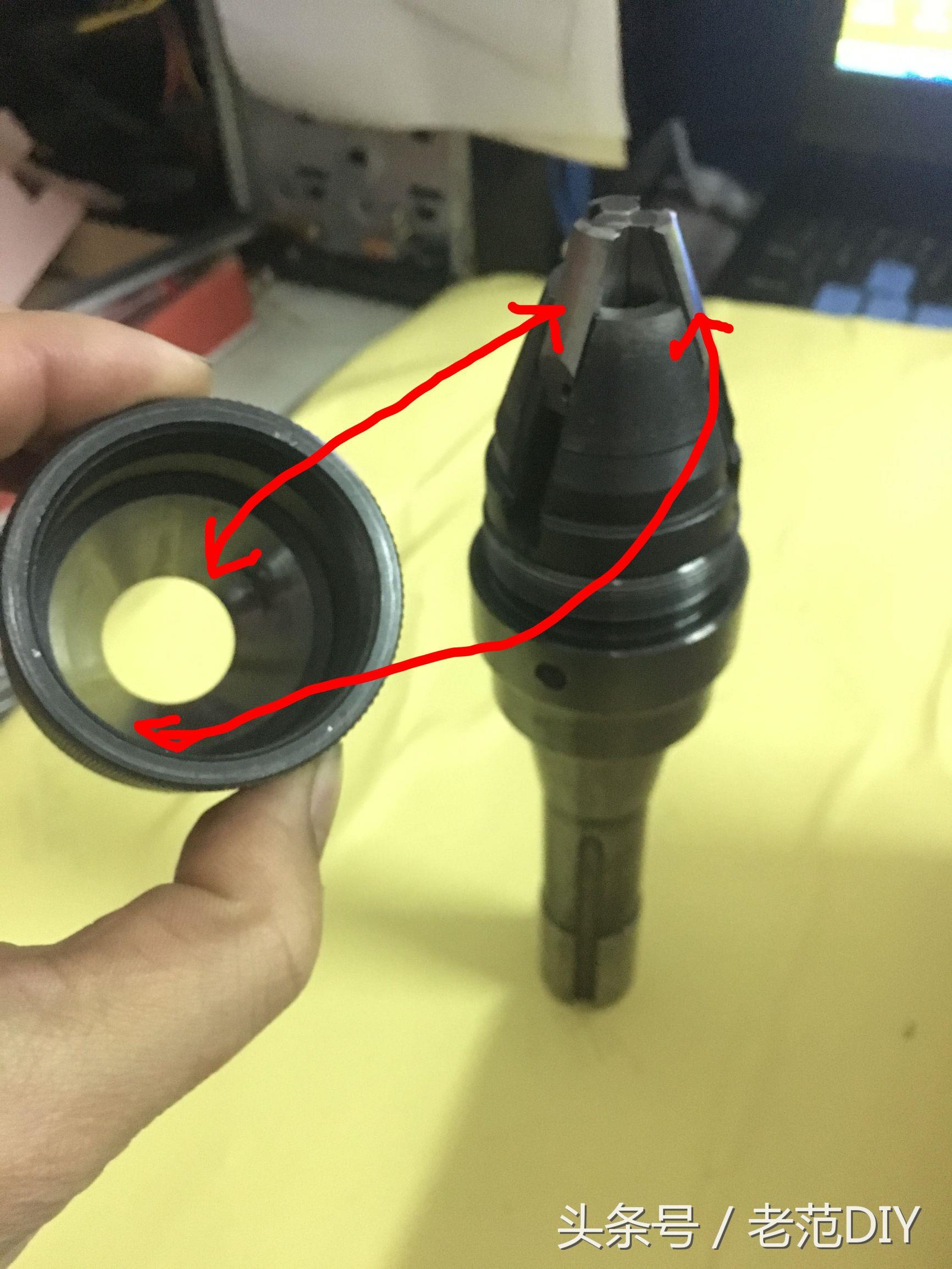 下面图片是普通的机械式钻夹头,这货得配个小扳手才能上紧,有时齿条打坏了,得用铜棒敲打才能上紧,或者松开。敲过手上的,来报个名。哈哈,这货确实不好用。