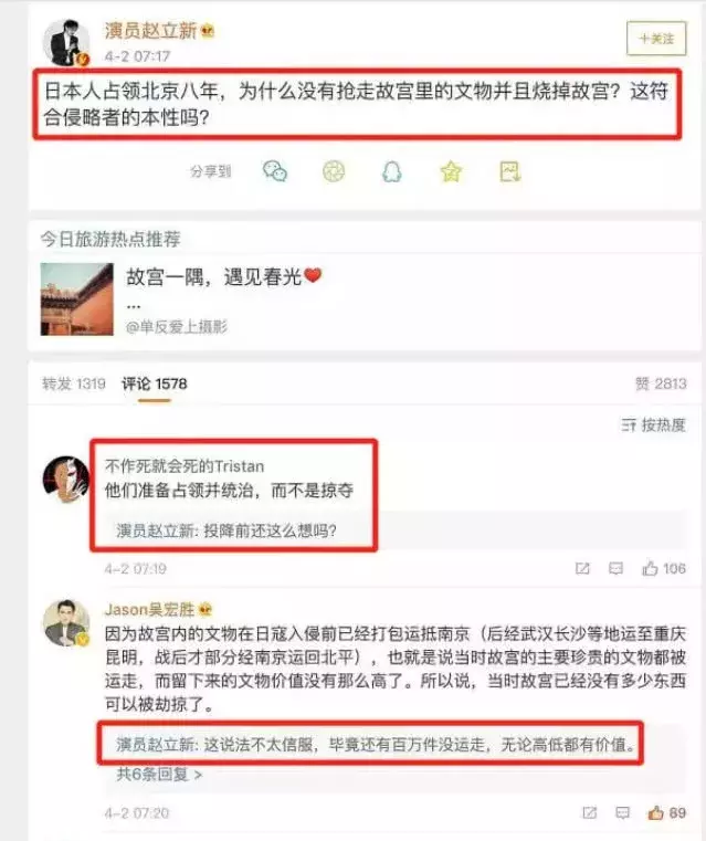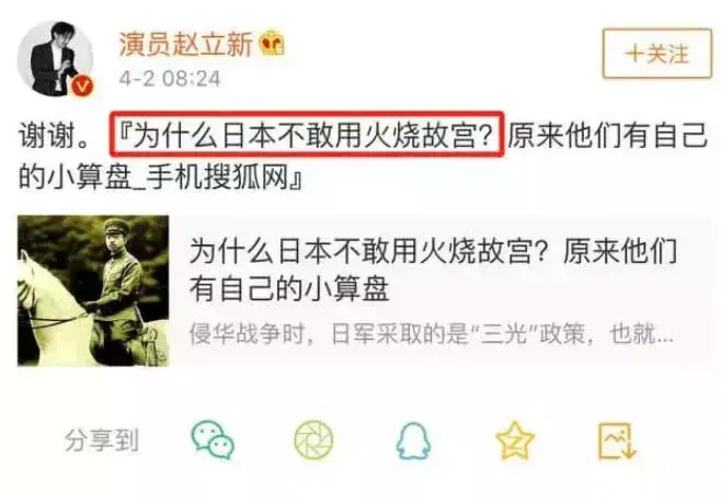 此前,赵立新在微博发表的关于侵华日军的言论遭到了@紫光阁、@共青团中央、@中国反邪教 等隔空回应,称其“观点太天真”、“对本国以往历史,应该略有所知”。