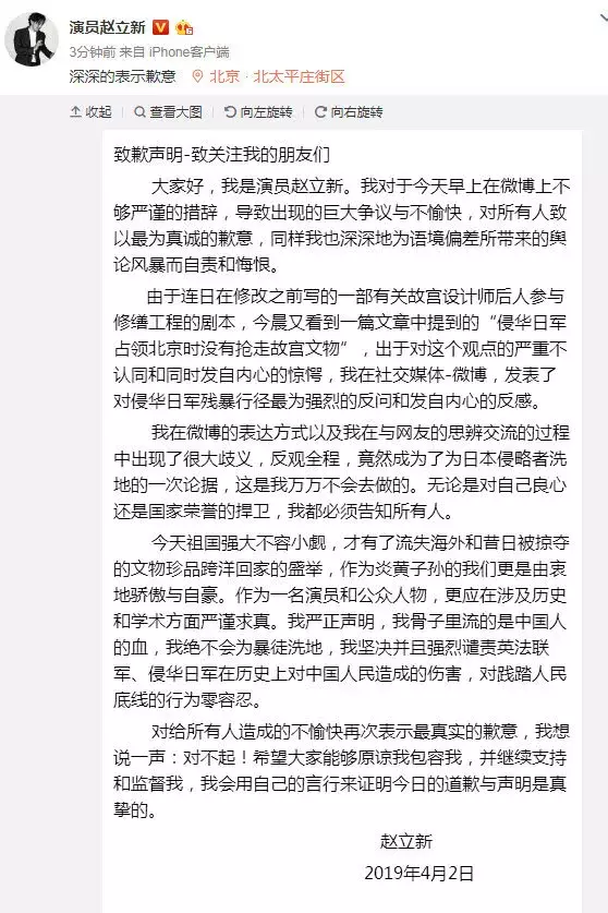 4月3日凌晨,赵立新发布“致歉声明”,称是“语境偏差造成的舆论风暴”,并严正声明:“我骨子里流的是中国人的血,我绝不会为暴徒洗地,我坚决并且强烈谴责英法联军、侵华日军在历史上对中国人民造成的伤害,对践踏人民底线的行为零容忍。”