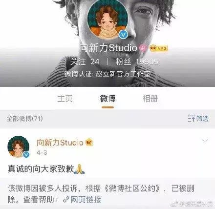 在@向新力studio 清空微博前,转发的致歉声明已经“因被多人投诉,根据《微博社区公约》,已被删除”。
