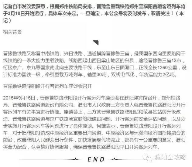 记者自市发改委获悉,根据郑州铁路局安排,晋豫鲁重载铁路郑州至濮阳首趟客运列车将于3月18日开始运行,具体车次未定。