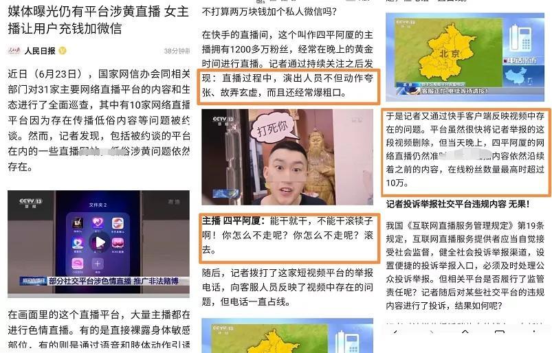 网红不是铁饭碗,今天央视新闻报道了网红主播四平阿厦,每天晚上在直播过程中,表演夸张,故弄玄虚,而且经常爆粗口的报道,四平阿厦在KS拥有1200多万粉丝,也曾是一线网红,记得早两个月前,小沈龙与之连麦PK就已经给出友情警示,而今晚的央视新闻不仅对该主播进行了报道,还播放了四平阿厦直播时的低俗搞怪片段,新闻记者拨打了投诉电话无人接听,向平台投诉后无果,当晚仍旧正常直播,依然延续着同样的直播内容,在线粉丝数超过10W....