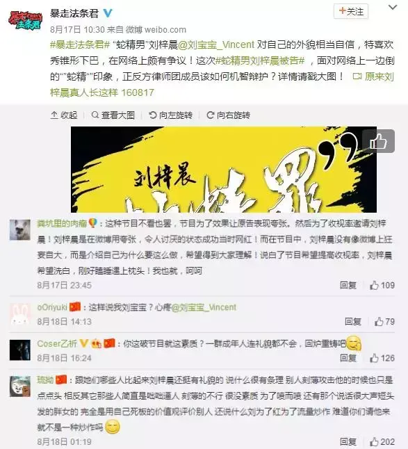 刘梓晨在《暴走法条君》里有礼貌,也不咋插话,人身攻击也一笑了之,看起来好有礼貌,但我们回顾一下他在微博上的言行。