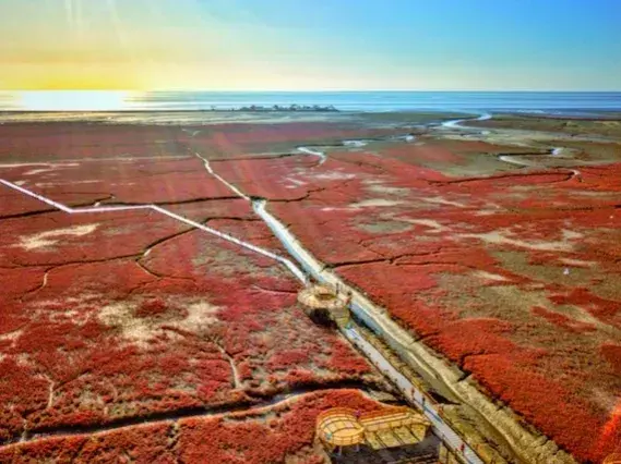 首先是盘锦北站,有红海滩国家风景廊道,这里是中国最大的湿地保护区之一,你可以看到一望无际的红色碱蓬草,在阳光的映衬下格外鲜艳。