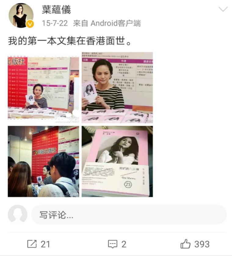 叶蕴仪找到了自己爱好,成为了一个艺术家,为此,她专门去学习艺术,取到了自己的硕士学历;她将个人爱好发展成为了工作,经常做白瓷,或为人定制或展览;她写作并出版了自己的散文集,生活丰富。