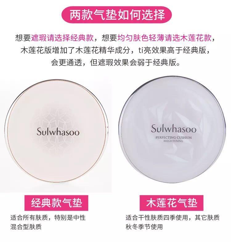 说一下雪花秀的气垫产品。前面已经提到,爱茉莉旗下的很多品牌,包括赫拉、兰芝、iope都有自己的气垫产品,雪花秀也推出了自己的气垫产品:致美润白气垫粉底液和采淡致美气垫粉底液两款粉底液产品。