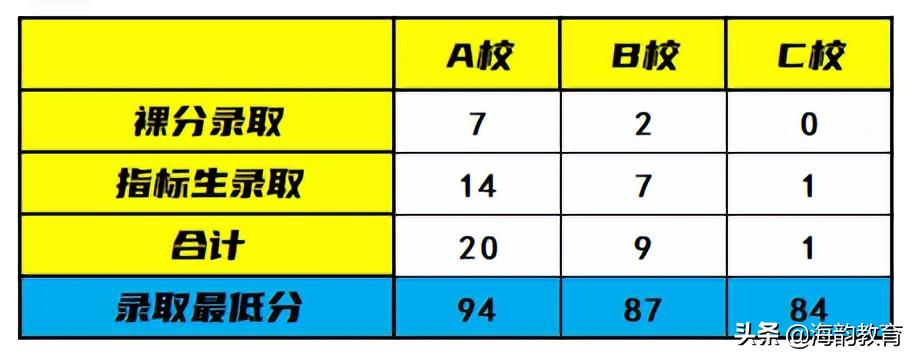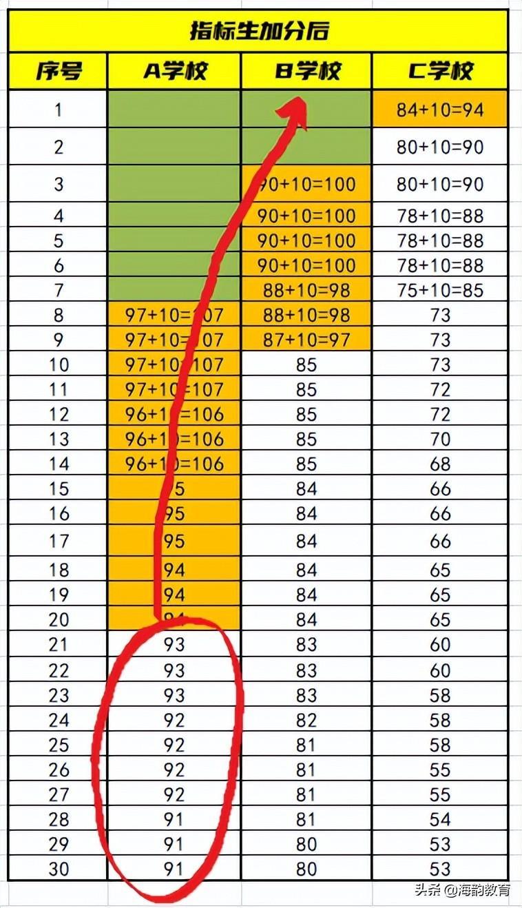 A校考上重点高中的最低分,是94分。而在B校,其实只要87分;如果在C校,甚至只要84分就够了。