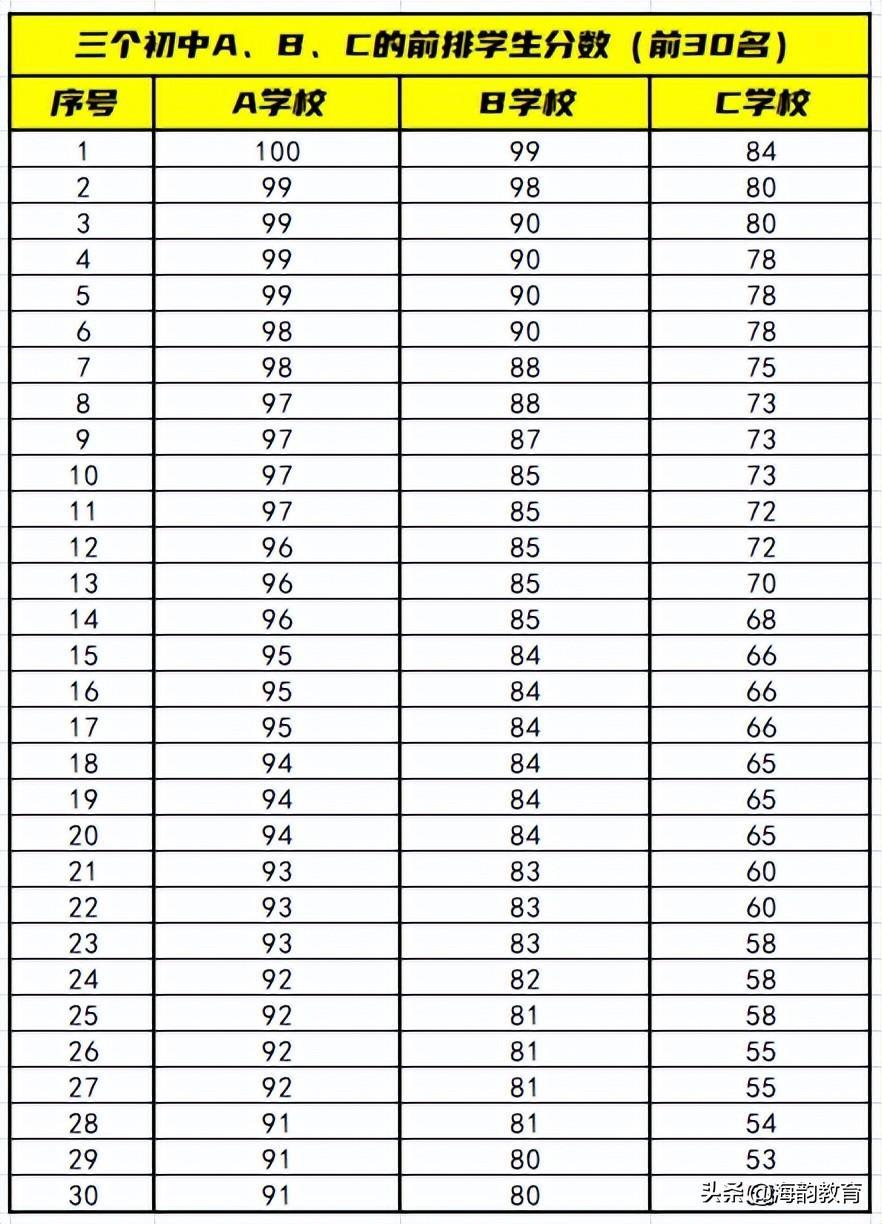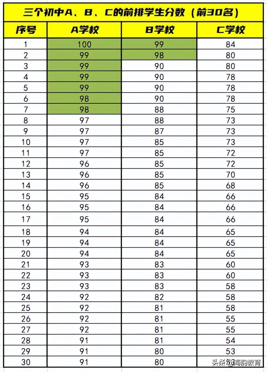 不难看到,A校确实是实力强劲。前30名都在90分以上。B校虽然也有个别牛娃,但整体就差了很多,只有6个90分以上的。至于C校,确实挺差,最高分才84分。