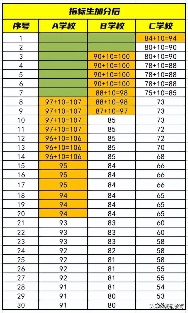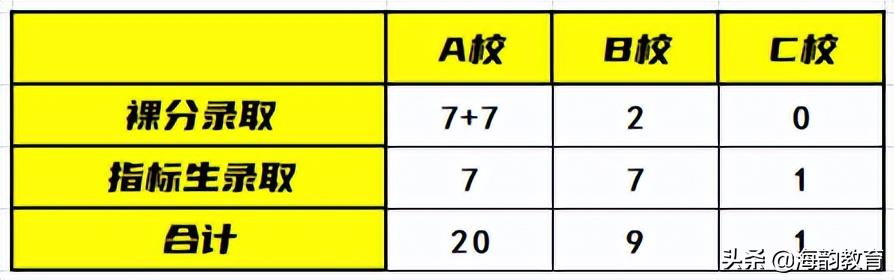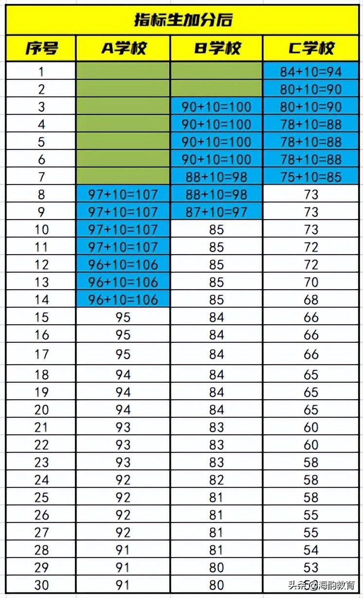 这样,A校的前7名,B校的前2名,就以非指标生的身份被直接录取了(绿色部分)。