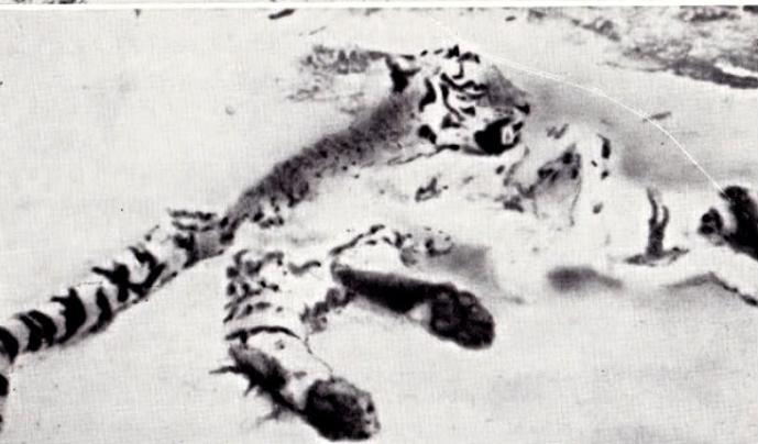 好在这场“血案”并非无迹可寻。这张照片,是苏联动物学家马扎克在其著作《苏联的哺乳动物》第六章中披露的,他并描述了1956年当地动物学者塞西耶夫在西伯利亚观察到一头老虎如何被另一头猛兽猎杀的经过。事实上塞西耶夫提供了两次在这一地区发现被杀死老虎残骸的情况,另一次在1960年。不过,个人认为1956年的那一次,与这头死不瞑目的老虎更为吻合。