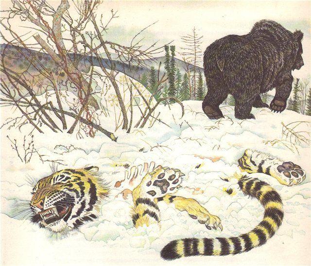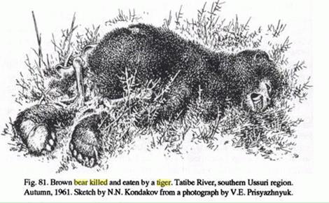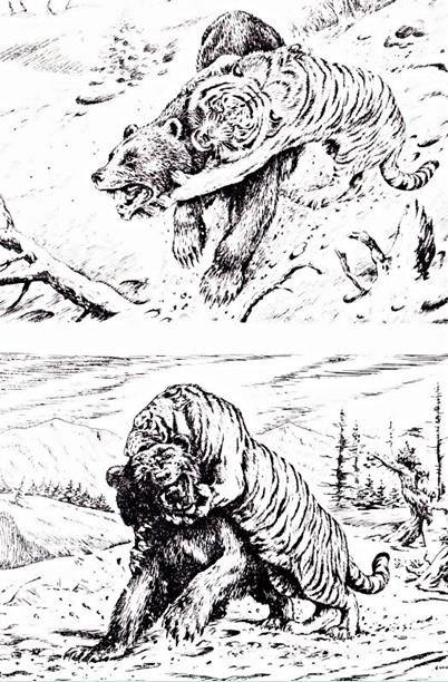 平心而论,虎是一种危险的动物,棕熊袭击老虎不如袭击赤鹿、野猪等更容易,而且还有被反击致死的风险,所以大多数时候,棕熊不会实施这样的攻击。唯一的例外是冬季。棕熊和黑熊不同,它是否冬眠取决于能否在秋季吃到够多的食物,获得足够的脂肪储备。如果冬天来得太早或者受到什么干扰,棕熊不能冬眠,那在整个冬天它都会成为丛林中的恶魔。饥饿的棕熊会忘掉一切清规戒律,向无论老虎还是人类的所有目标发动攻击。由于其穷凶极恶,西伯利亚的居民们对这种饿熊的嗥叫闻之色变,称其为“撒旦”。