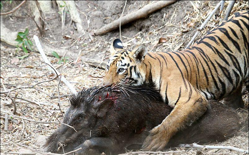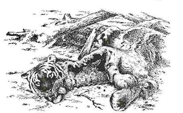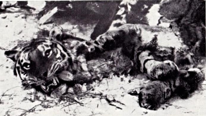 它以后又回来了两次,一次把剩余的野猪吃光了,一次则开始吃被杀死的老虎,直到人的到来。