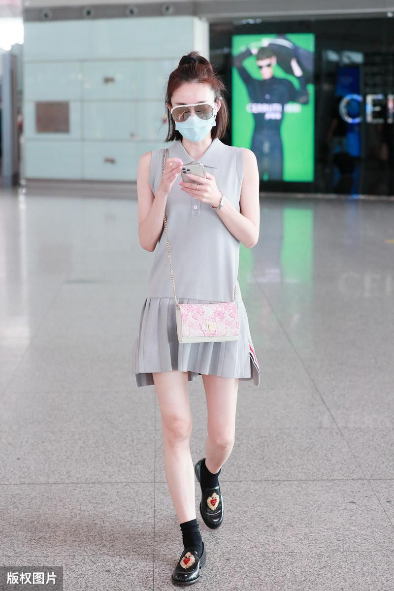 王丽坤,无袖Polo连衣裙+皮鞋+短袜+斜跨链条包,减龄装扮。
