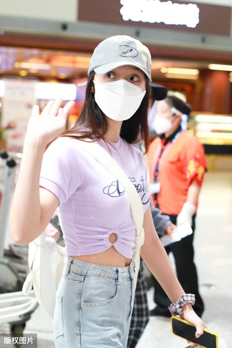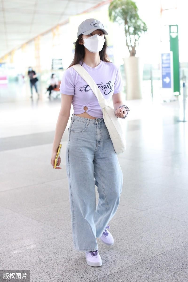 林允,香芋色抽绳短款T恤+阔腿牛仔裤+白色板鞋清爽少女。